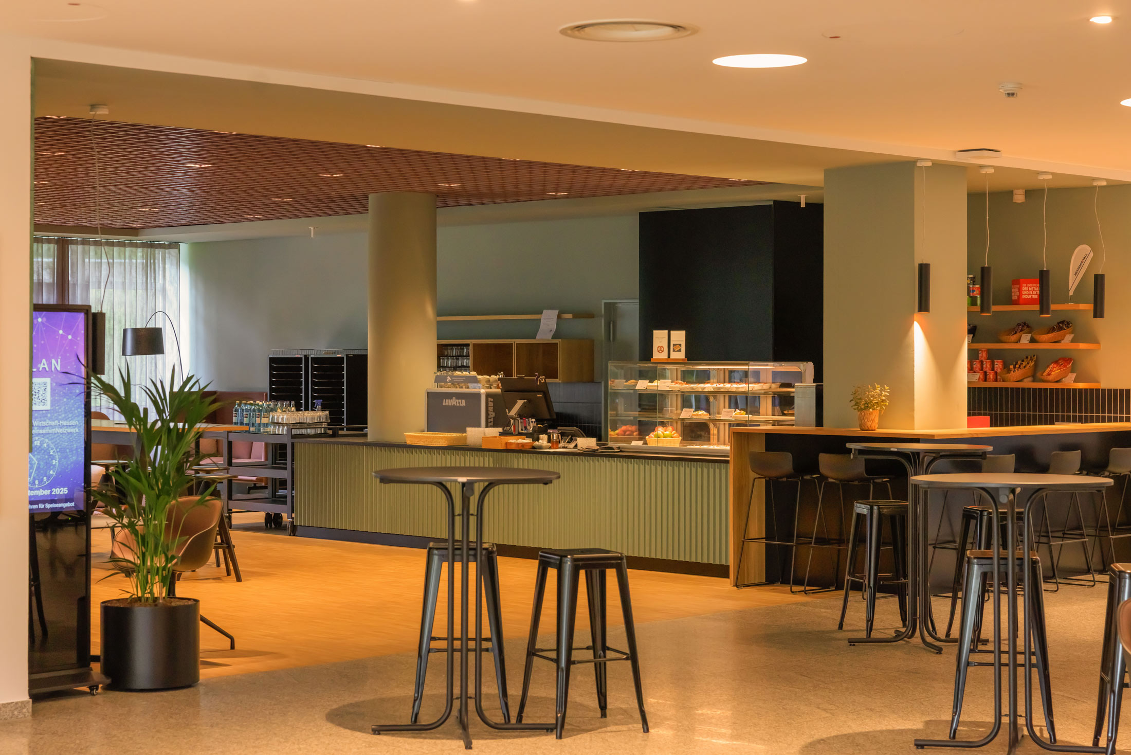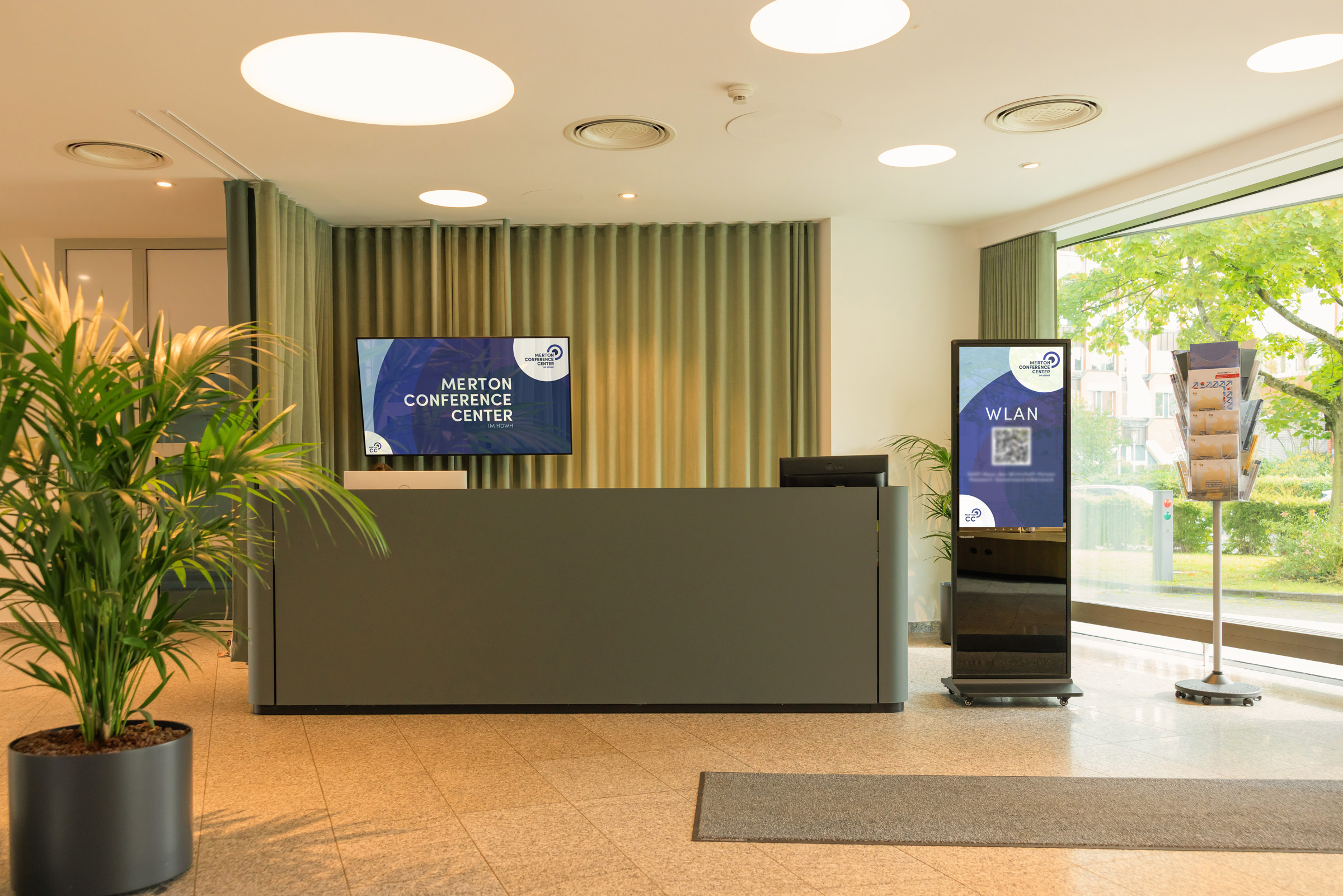 Als erster Kontaktpunkt prägt unser großzügiger Empfangsbereich den Gesamteindruck Ihrer Veranstaltung. Hier legen wir besonderen Wert auf eine entspannte Atmosphäre. Verschiedene Sitzmöglichkeiten laden zum ersten Kennenlernen und Networken ein, die großflächigen Screens bieten Platz für Ihr Branding. Bei Bedarf können Sie noch weitere öffentliche Flächen im Merton Conference Center dazubuchen.
